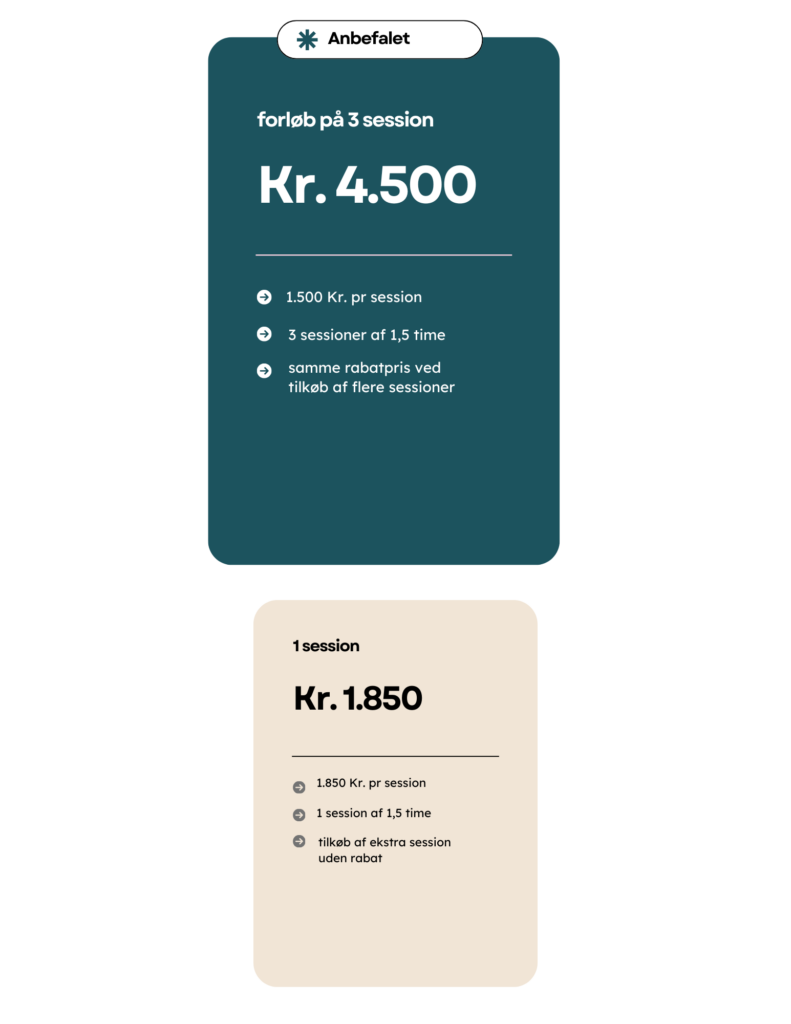 En enkelt session er for jer, der ønsker at mærke metoden og rummet. Et forløb på 3 sessioner er for jer, der ønsker at skabe varig forandring sammen.